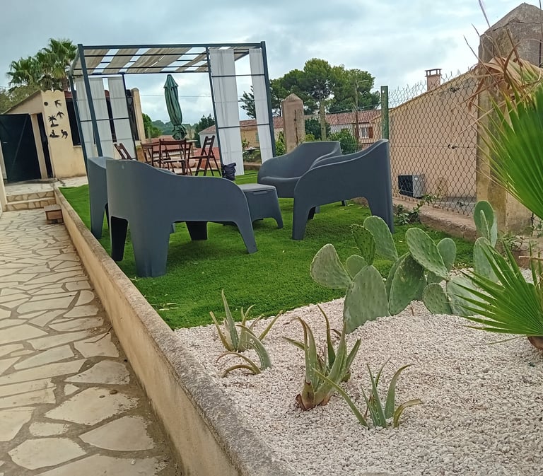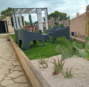 Terrasse accès direct de la pièce de vie, exposée Sud.... table, chaises et salon de jardin....